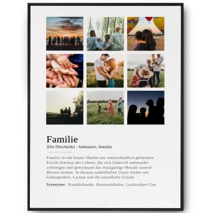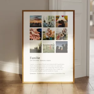 Die Bedeutung der Familie ist unbestreitbar – sie benötigt uns genauso wie wir sie. Das Gefühl, Teil einer Gemeinschaft zu sein, beruht auf einem ständigen Austausch von Geben und Nehmen. Ganz gleich, ob groß oder klein, die Familie akzeptiert dich bedingungslos, und das ist ein erfüllendes Gefühl. Innerhalb dieses Kreises kannst du dich entfalten, Energie tanken und einfach mal die Seele baumeln lassen. Bei MEINPOSTER24 streben wir danach, dir zu helfen, das ideale Familienposter zu gestalten, das die Dynamik und Energie deiner Familie widerspiegelt. Ob es sich um ein Hochzeitsposter handelt, das an den “schönsten Tag des Lebens” erinnert, oder um ein Kinderzimmerposter, das die Geburt eines Kindes zelebriert – unsere Vielfalt an Beispielen bietet Inspiration. Wenn deine Kinder älter sind, könnt ihr gemeinsam personalisierte Familienposter erstellen. Das Sammeln von Ideen, die Auswahl von Bildern und das Überlegen von Texten fördern die kreative Teamarbeit und stärken den familiären Zusammenhalt.